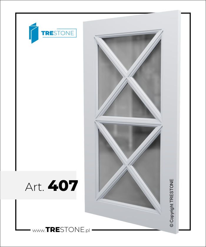 Art. 407 - witryna ze szprosami. Szerokość ramki i wzór szprosów dopasowany do pozostałych frontów pełnych. Front bez szklenia.